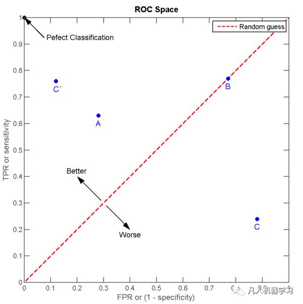 在红线上方,偏Perfect Classification的区域,我们认为是优于随机猜测。因为,在红线上的任意一点垂直向上的点,都有同样的FPR,但总是得到更高的TPR:在错误不变的情况下,我们的Recall变高了。反之,在红线下方的点,都认为是劣于随机猜测。