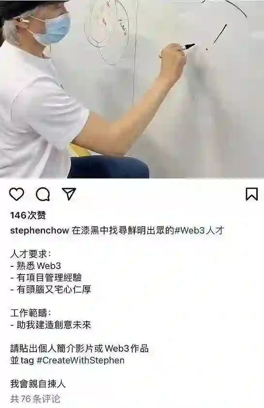 【周星驰注册社交账号招聘Web3人才】10月18日,周星驰开通社交平台账号,并发文招募Web3人才。他在白板上写下“请人”二字,并附言:在漆黑中找寻鲜明出众的Web3人才。要求熟悉Web3,有项目管理经验,有头脑又宅心仁厚;工作范围是“助我建造创意未来”,并表示自己会亲自挑选人才。(蓝鲸TMT)
