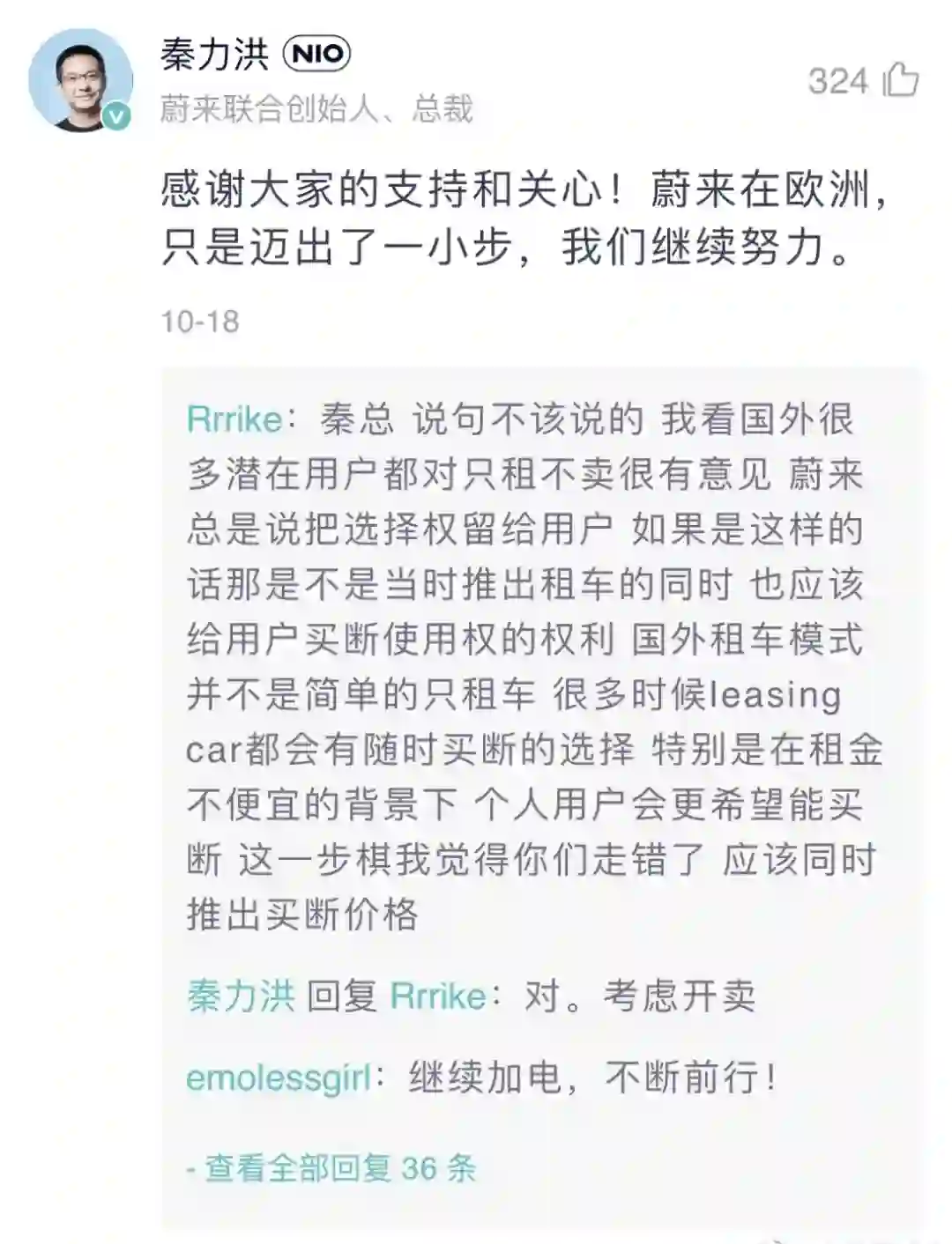【蔚来“只租不卖”欧洲订阅模式或有变动,秦力洪称考虑开卖】10月18日,针对网友所提蔚来汽车应在欧洲放弃“只租不卖”、提供“买断”选择的建议,蔚来汽车总裁秦力洪在用户APP中回应称“考虑开卖”。日前,蔚来汽车宣布以“订阅模式”进入德国、荷兰、丹麦、瑞典四国市场,提供ET7、EL7(ES7)、ET5三款车型,车辆订阅期限从1个月至60个月不等。(澎湃新闻)