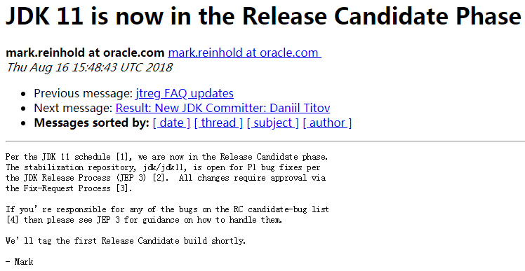 稳定仓库 jdk/jdk11 目前是开放的,可用于 P1-P2 错误修复,并在经过批准后,可根据 JDK Release Process (JEP 3),进入 late enhancements 阶段。