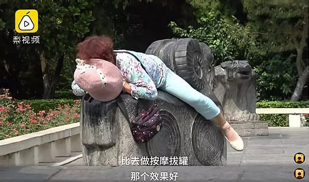 今年7月份,洛阳某公园内,正是三伏高温天,一群大妈来到公园内,躺在地上、石雕上,说是在进行“石疗”养生。