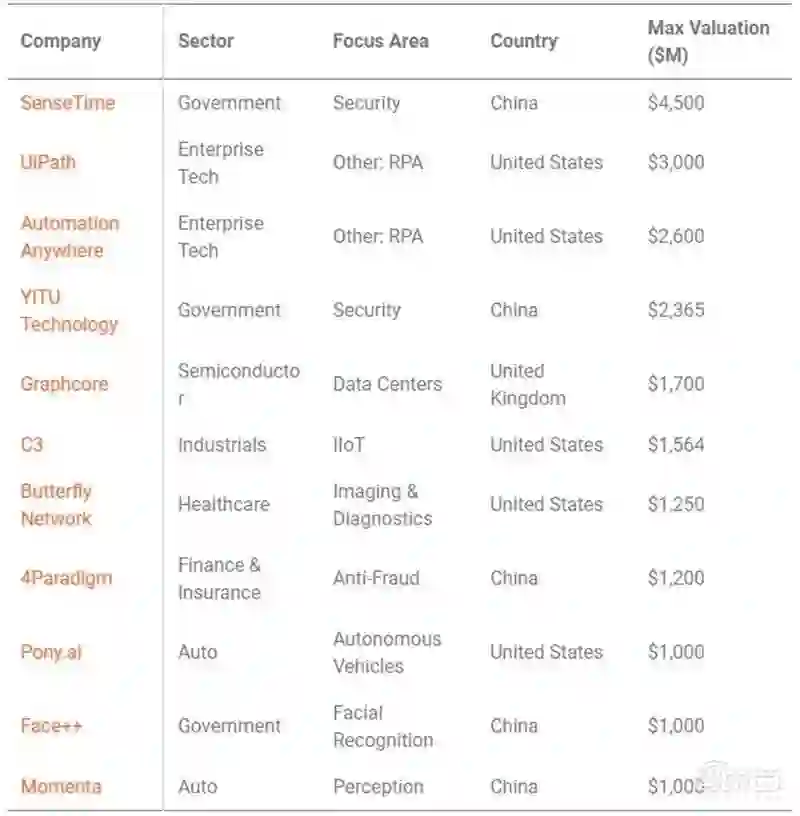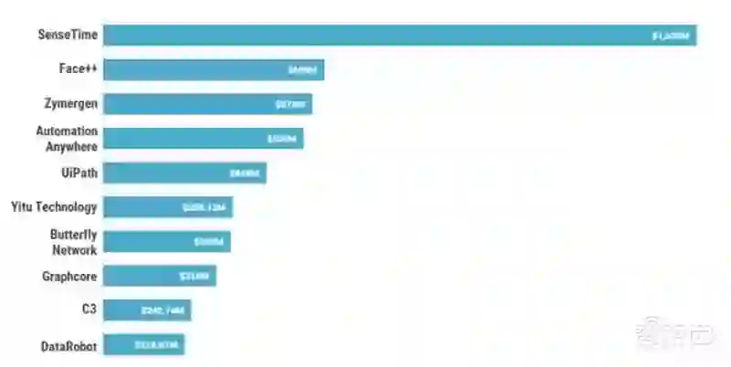 其他的一些公司,如SenseTime和Graphcore,估值已超过10美元。并且名单上共有11家公司是独角兽(估值10亿美元以上的私人公司)。