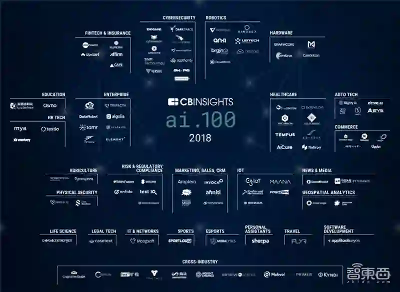 从2017年起,CB Insights公司每年都会评选出100家明星AI创业公司,今年也不例外,这些公司为人工智能应用提供硬件和数据基础设备,优化机器学习工作流程,或是在各个主要行业中应用人工智能技术。根据专利申请、投资者概况,新闻报道、市场潜力,合作伙伴关系,竞争格局,团队实力和科技新颖性等指标,CB Insights的研究团队从3000+公司中选出了今年的100家明星初创公司。