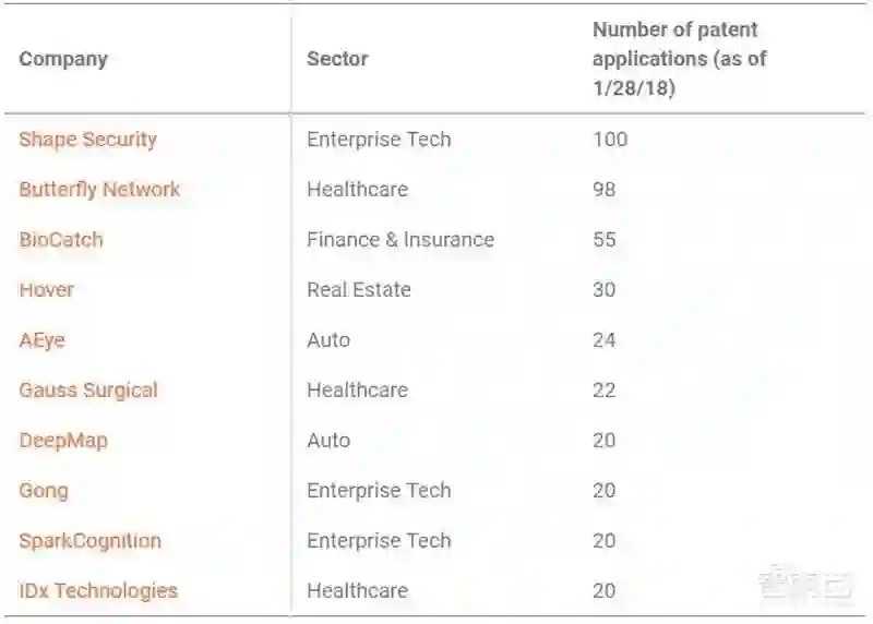 专利申请是衡量公司研发重点的一个指标。 100家创业公司中共有62家拥有600多项美国专利。