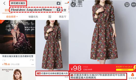 图1. 用户搜索「碎花裙长袖女」,搜索结果页商品原始标题过长无法完整显示,只有点击进入详情页才能看到完整标题。
