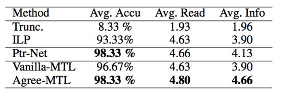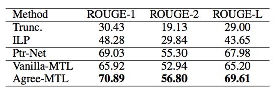 我们使用了淘宝女装类目下的商品标题数据进行了实验,对比了五种不同的文本摘要方法。第一种是baseline方法,根据目标长度直接截断方法(Trunc.);第二种是经典的整数线性规划方法(ILP),需要对标题进行分词、NER、TermWeighting等预处理;第三种是基于Pointer Network实验的encoder-decoder抽取式方法(Ptr-Net);第四种是多任务学习方法,直接将两个子任务的损失函数相加作为整体损失函数进行优化(Vanilla-MTL);第五种是本文提出的考虑Attention分布一致性的多任务学习方法(Agree-MTL)。