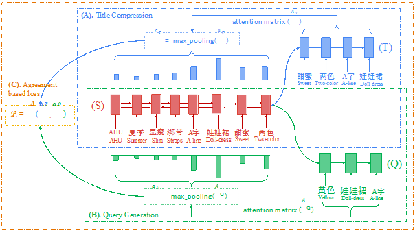 该方法同时进行两个Sequence-to-Sequence学习任务:主任务基于Pointer Network模型实现从原始标题到短标题的抽取式摘要生成,辅任务基于带有注意力机制的encoder-decoder模型实现从原始标题生成对应商品的用户搜索query。两个任务之间共享网络编码参数,训练过程中对两者在原始标题上的注意力分布进行联合优化, 使得两个任务对于原始标题中重要信息的关注尽可能一致。