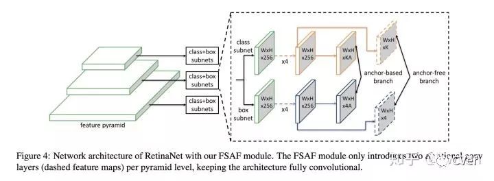 先来看看FSAF的结构。文章提出的FSAF以RetinaNet为主要结构,添加一个FSAF分支和原来的classification subnet、regression subnet并行,可以不改变原有结构的基础上实现完全的end-to-end training,特别是,FSAF还可以集成到其他single-stage模型中,比如SSD、DSSD等。