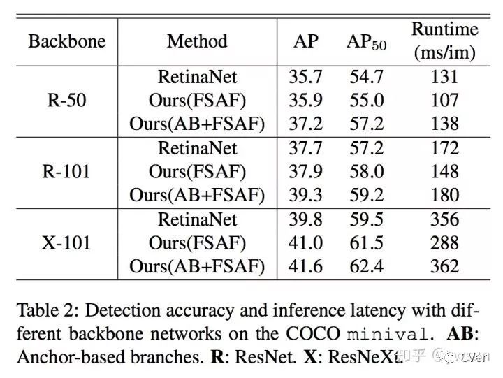 作者在ablation study部分分析了anchor-free的必要性,online feature selection的重要性,以及选择的feature level是不是最优的。同时还指出FSAF非常robust和efficient,在多种backbone条件下,都有稳定的涨点。在ResNext-101中,FSAF超过anchor-based1.2个点,同时快了68ms,在AB+FSAF情况下,超过RetinaNet1.8个点,只慢了6ms,效果也是非常显著的。