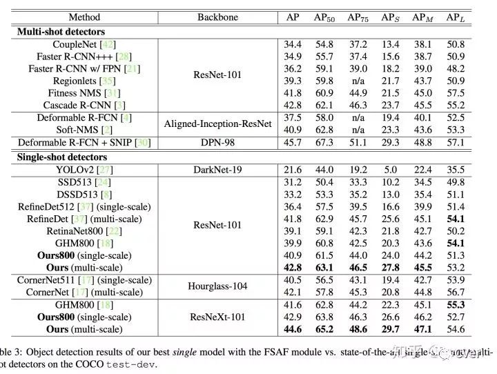 值得注意的是,FSAF模块没有了anchor scale、aspect ratio等概念,是一个anchor-free的检测方法(和CornerNet不同)。