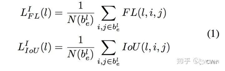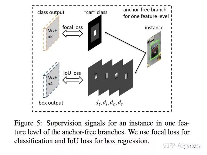 box regression output是一个WxHx4大小的feature map,那么在坐标为(i,j)的点上是一个长度为4的向量,分别表示4个偏移量。假设一个instance,其在feature level为 对应的有效区域,这个instance会影响内的每个值。假设坐标为(i,j),长度为4的向量 表示这个instance的上、左、下、右4边界和(i,j)的距离,然作为最后输出结果。分支采用IoU Loss,整个regression loss是一张图片中每个有效区域的IoI Loss的均值。