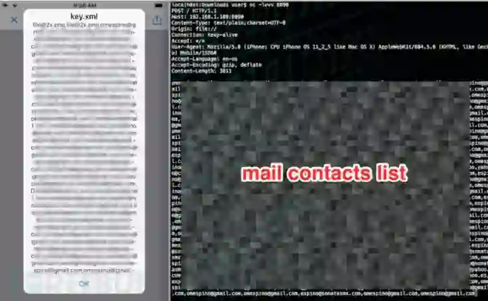 后来有一天,我突然想到了一种提升漏洞利用且安全无害的方法,那就是我可以用HTTP请求,像“GET”方式一样,尝试对本地APP客户端资源进行获取!BingGo!我一试,真成了!我可以用这种方法获取到雅虎邮箱iOS应用的整个缓存数据,其中包括用户cookie、通讯录列表、邮件内容等等。
