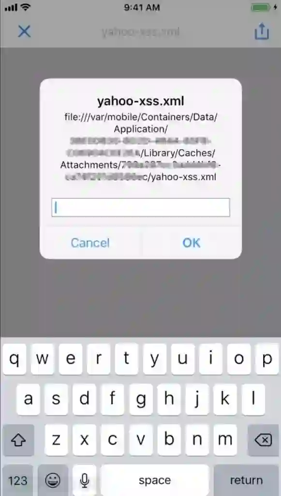 用雅虎邮箱iOS客户端(Yahoo! Mail iOS APP),进入你的收件测试雅虎邮箱,查看 yahoo-xss.xml 附件,打开它,看看是否有XSS反应。结果是当然有的,会吓了你一跳。如下: