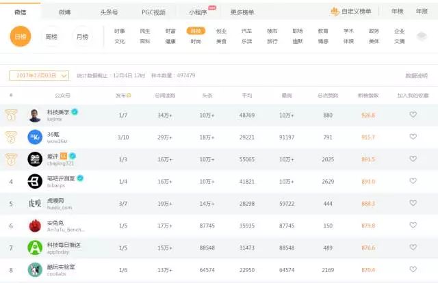 你可以在这查询公众号,微博,头条号,PGC视频,小程序的榜单,新榜会根据阅读,点赞,转发等指数算出新榜指数,进而有了各大榜单。
