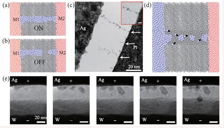 图5(c)所示为阻变存储器经过Forming 过程后对应的显微结构[38]。在电场作用下,活性Ag电极产生的Ag+逐渐沉积形成Ag金属导电细丝,使得两电极直接相连,电流瞬间降低。这些导电细丝一般只有一条连通正负级,其余的导电细丝尚未连接起正负极。这是由于细丝生长过程是一个自我限制的过程,一旦有一根细丝连通正负极,其余细丝的生长便会因为电路导通后电场强度的降低而受到限制。由于靠近Pt 电极处的电势更低,导电细丝倾向于从Pt 端开始逐渐向Ag电极端生长。此外有两点与传统ECM理论[39]不符合的现象:一是,导电细丝是由离散的颗粒组成,而ECM理论则认为导电通道是连续的形貌;二是,最细的导电细丝靠近Pt 电极端,而ECM理论则认为导电细丝一般在靠近活性电极Ag 的那一侧更细。细丝的几何形状对EMC实际打开与关断的写入操作尤为重要,这是因为金属细丝的溶解以及形成总是在最细的部位进行的。通过观察器件断开(OFF)后的显微结构,可以发现在电介质和Pt 的界面处的导电细丝会先溶解[38]。通常这些导电细丝不会完全溶解,这是由于当电介质和Pt 界面处最细的细丝断裂后,电路断开,引起氧化还原反应的效率降低。在器件断开(OFF)后再次打开(ON)时,电介质中残留的细丝便会促进后续的细丝生长。通过构建W/a-Si/Ag“三明治”结构,用原位TEM观察了导电细丝的生长过程,如图5(e)所示。金属钨针尖上包覆的非晶硅使得导电细丝必须穿过a-Si 层后才可以实现Ag 电极和W针尖的电导通。因而可以观察到导电细丝的生长是始于活性Ag 电极一侧而逐渐向惰性W电极一侧生长。这些Ag 颗粒也呈现圆锥型,并且朝Ag 电极那一侧的要宽一些。这些实验结果说明导电细丝的生长受电解质类型的影响,这是由于金属离子在不同电解质中的迁移势垒不同造成的。