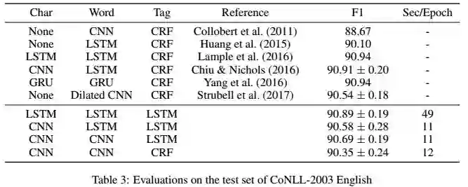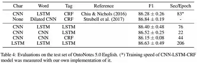 实验证明CNN-CNN-LSTM的表现不逊色于其他架构,但使用CNN作为编码器和使用LSTM作为解码器比使用LSTM和CRF节省大量时间开销。