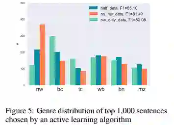 其次,本文分析了主动学习为这三个数据集选择的数据类别分布,对于no-nw-data,该算法选择的newswire(nw)句子多于无偏差的half-data(367 vs 217),证明主动学习算法可自动发现现有数据中缺失的数据类型,选择并添加到原有数据集中。