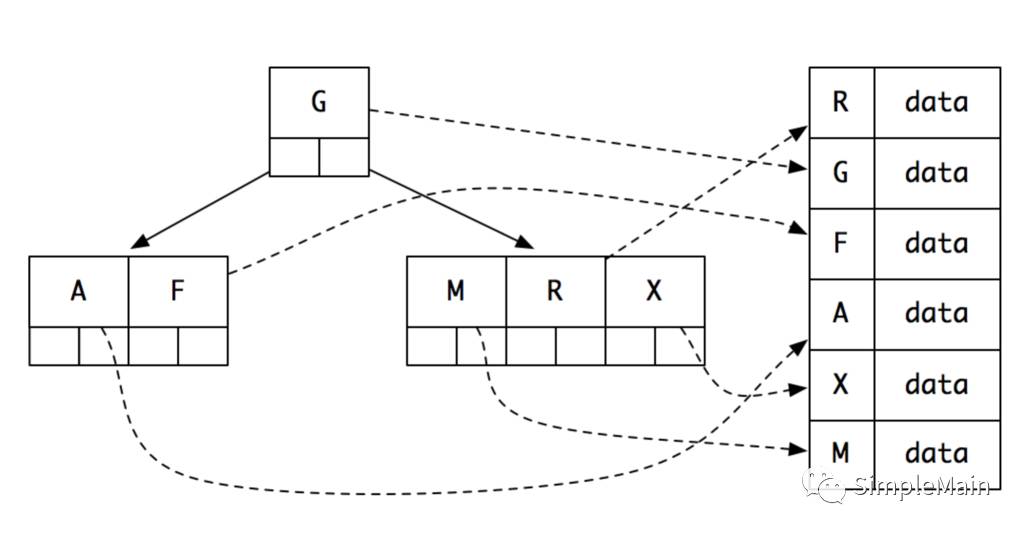 我画了一个不太漂亮的B树的图。我们可以看到B树里面,每个结点有这样的特点:不论是叶结点还是非叶结点,都含有Key和一个指向数据的指针。这样,一旦找到某个结点以后,就可以根据指针找到对应的磁盘地址。