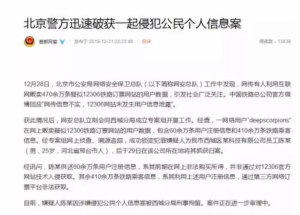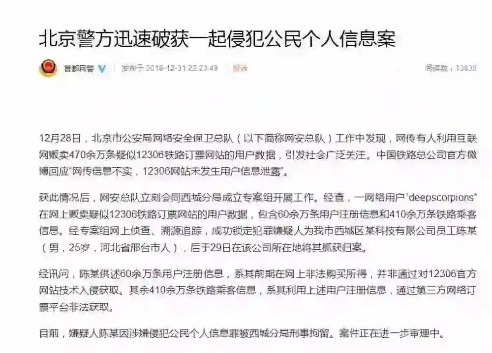据北京市公安局网络安全保卫总队微博消息,北京警方破获一起侵犯公民个人信息案,网上贩卖470余万条疑似12306铁路订票网站用户数据的犯罪嫌疑人陈某,已被刑拘。