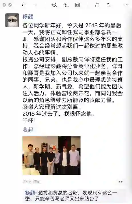 他在朋友圈发文称,“根据公司安排,副总裁周详将接任我的工作,总经理彭翻将分管商业化业务。”而他将以新的角色继续贡献力量,望大家理解此次离别。