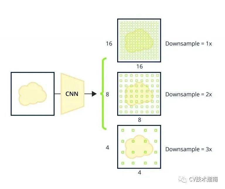 为了获得对图 2 中网格中每个位置的卷积神经网络预测,考虑一个 4 通道 8×8 特征图,其中每个通道输出每个位置一个框的 x、y、宽度和高度坐标。对于每个位置的六个框,考虑一个 4*6 通道的 8*8 特征图。使用anchor boxes的 SOTA 架构通常包含维度为 8 倍数的特征图。这是可能的,因为卷积神经网络本质上对输入进行下采样,同时通过 2D 卷积和池化操作保留重要的空间特征,并且完全卷积层输出密集的特征图如图 3 所示。