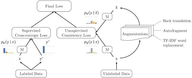 而对于未标记的数据,则应用一致性训练来强制预测未标记的示例和增强的未标记示例是否相似,如下图的右侧部分所示。