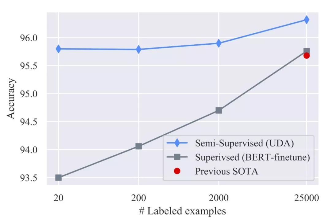 UDA在低数据体系中出乎意料地有效。只用20个标记示例,UDA通过50000个未标记的示例,在IMDb情绪分析任务中实现了4.20的错误率。