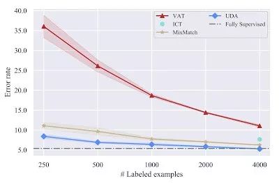 在4k示例情况下,UDA实现了5.27的错误率,与使用50k示例的完全监督模型的性能相匹配。