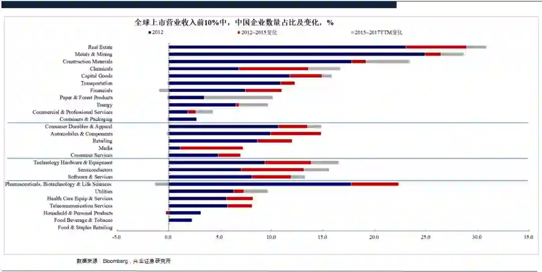 怎么解决经济发展不充分的问题?我们年报里有一张图,取了全球所有的上市公司每一个板块的数据。其中,最上面这一大块是传统行业,有金融、采矿、化工;蓝色部分是2012年中国企业数量的占比,可以看到中国在这些传统行业,历史上占比都很高。红色的部分是2012年-2015年的增量,灰色部分是2015年之后的增量。