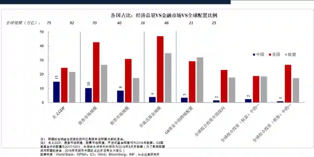 这两类资产加起来是40万亿美金,也就是说在全球40万亿美金对外跨境金融投资里面,对中国的配置比例只有1-2个点,但是你的GDP大概占了15%。