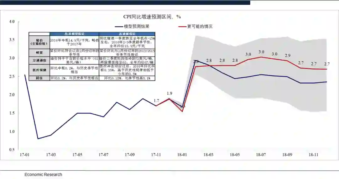 但是去年下半年由于环保全面性的铺开,各种化工品开始涨价。去年下半年尿素、化肥、农药,包括纸制品、养殖这个行业里面,很多的养殖户都因为环保原因被关掉了。化工品、食品的下游可是CPI。所以我认为去年的供给侧改革应该会在今年推升一定的CPI高度。从测算的角度来讲,我们认为红色这条线会更大一些。