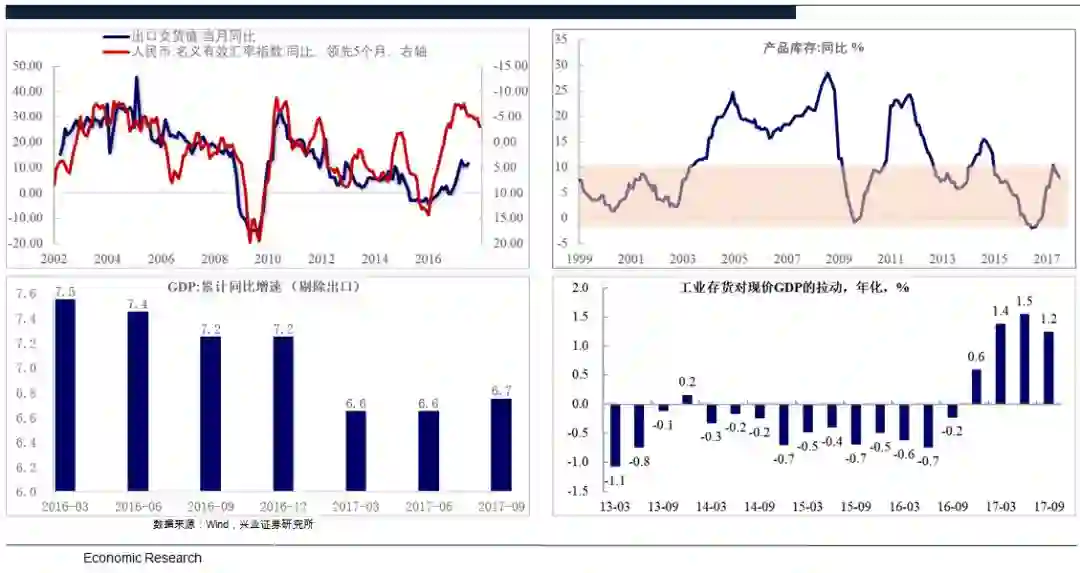 我们在讲中国经济的复苏,但是把外需剔除掉,单纯看内需,2017年数据是比2016年差的。也就是说,2017年因为出口,所以使得内需不足的部分被出口补上了,如果把四季度数据放进去这个情况更加明显。那么出口能好多久呢?我觉得外需的复苏是一方面,但是另一方面不可忽视,这一轮出口的反弹里面,2015年开始的贬值对于出口的贡献特别大。现在的问题是,我们的汇率现在升值速度有多快的问题,已经不再是贬值了。