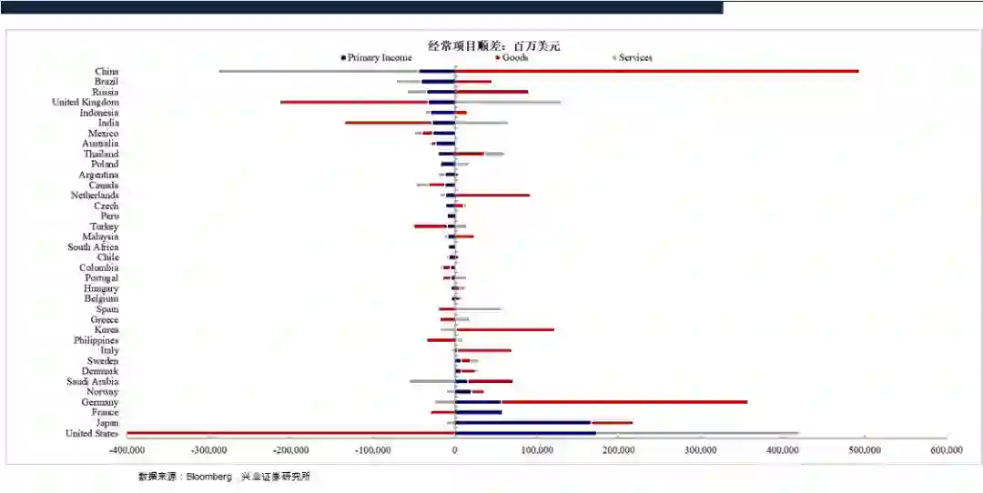 但是从经济角度来讲,“一带一路”也会解决一个问题。这是很多人都不怎么看的一张图(见PPT),这是全球主要经济体经常项目顺差的构成,上面的国家是中国,红色是货物贸易,我们是全球最大的顺差国,服务贸易我们是全球最大的逆差国。但很有意思的是中国是全球对外投资收益最大的逆差国。美国跟我们是完全反过来,它的货物贸易是最大的逆差,服务贸易是最大的顺差,但同时它是全球投资收益率最大的顺差国。