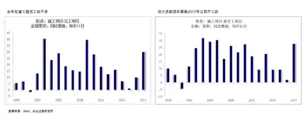 这里面讲一个什么故事呢?2017年因为某一种原因,使得在建很多项目的建设进度比较慢。这就是为什么经济会有惯性,就是去年的项目没有建完,那当然到了今年以后会接下来继续建,这就使得我们接下来的投资,至少一季度的投资还不错的原因。核心是这部分剩下的项目,它的建设,或者在投资里面能够支撑多久。
