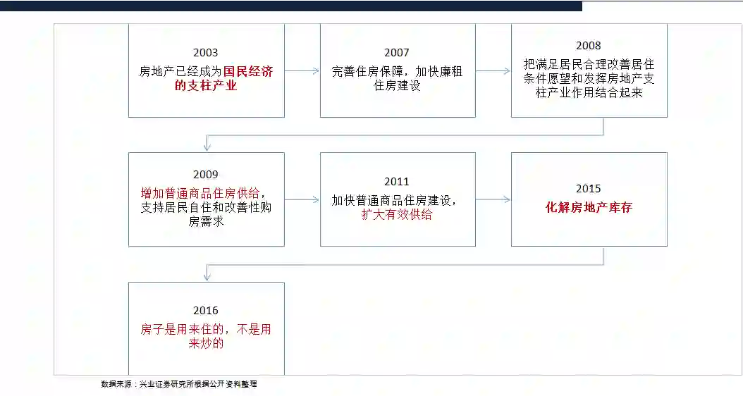 这是从2003年以来政府对于房地产定调的变化。2003年,政府说房地产是国民支柱产业,翻译一下就是2003年我们GDP很少,所以拉动GDP要靠房地产;到2007年,变成了加快住房建设,不提拉动GDP了。因为2007年GDP增速是10%几,GDP已经不需要房地产拉动。但是那个时候住房不够,所以需要增加供给,否则的话,房价压不住。所以增加供给这的说法,从07年讲到2011年,一直在讲扩大有效供给;到2015年,变成化解库存。
