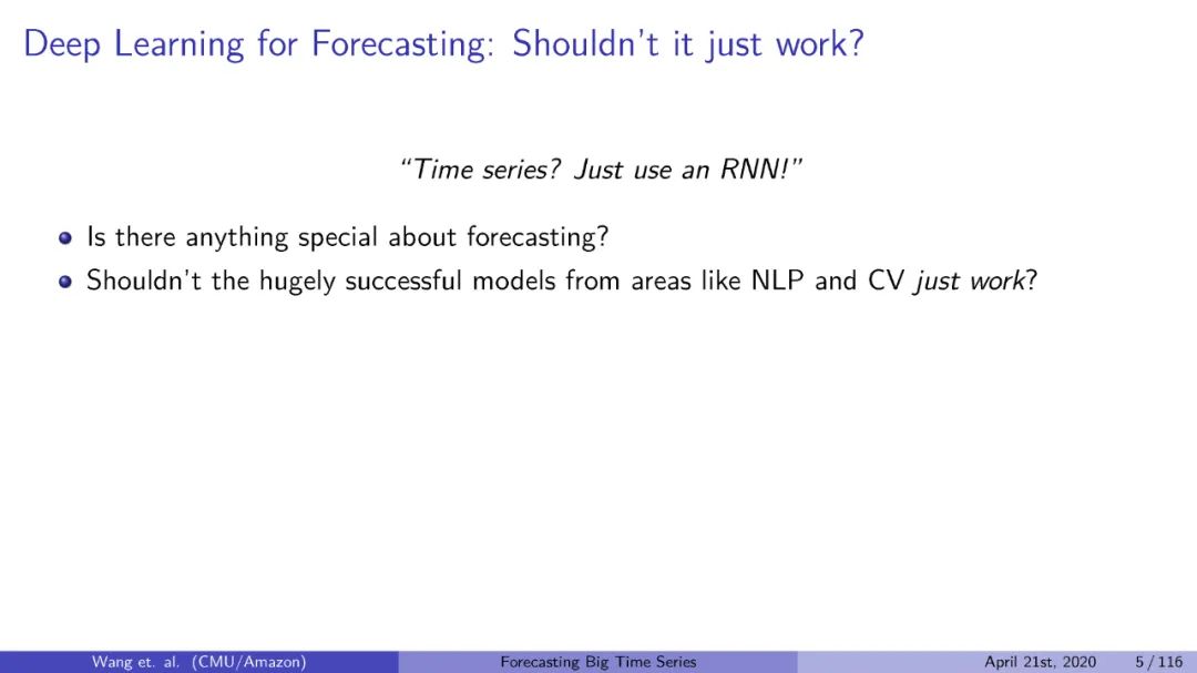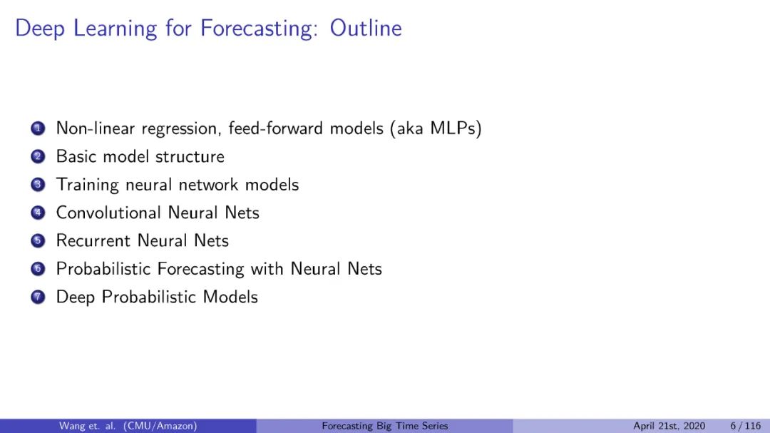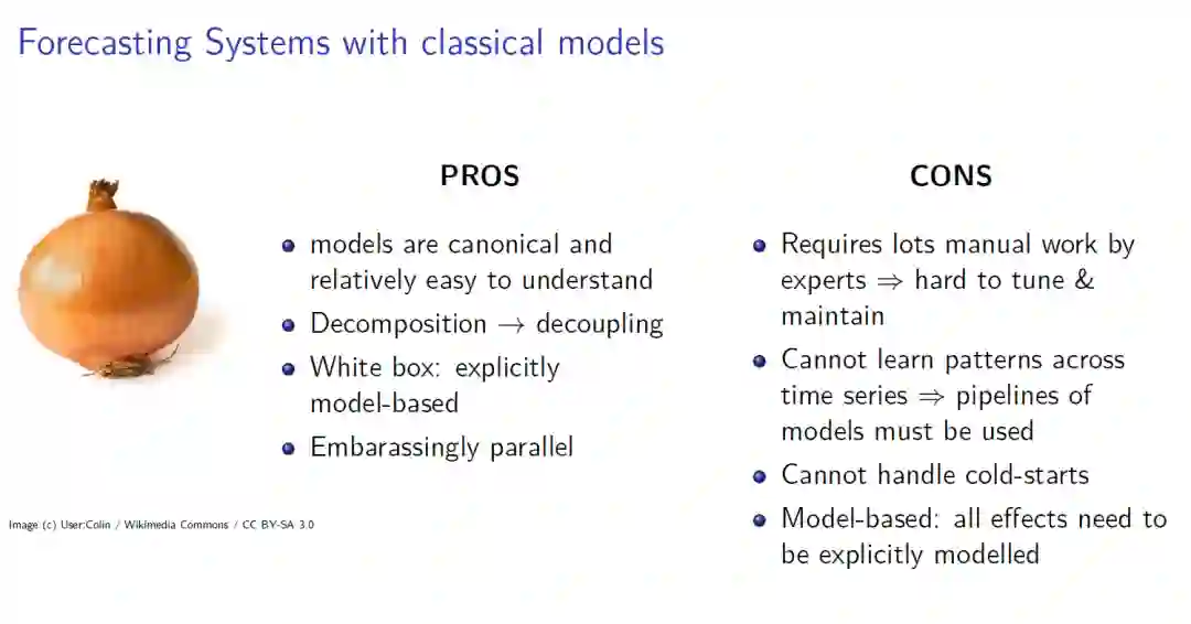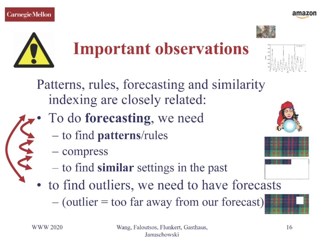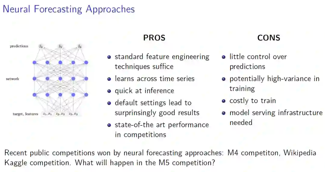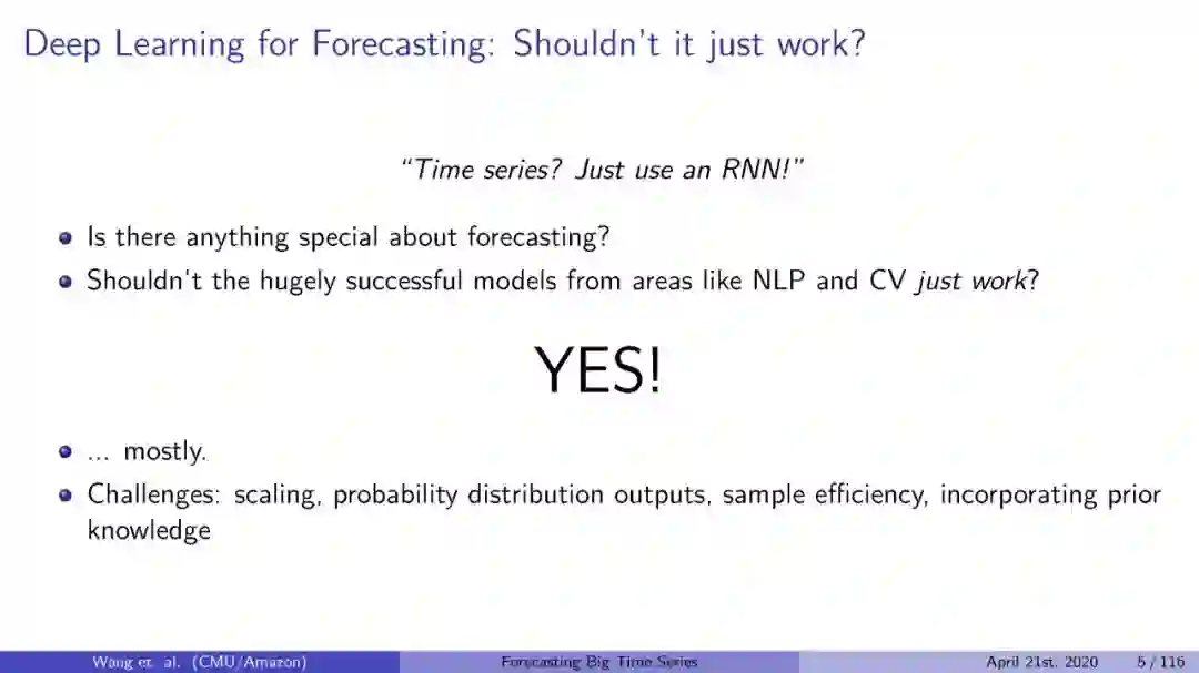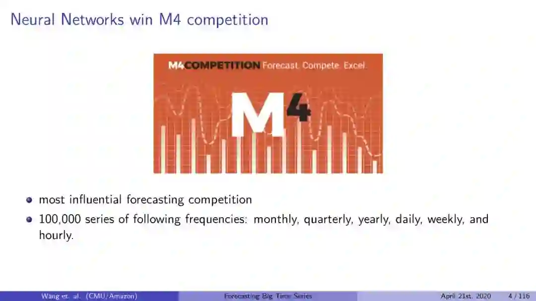 时间序列预测是业务流程自动化和优化的一个关键因素: 在零售领域,决定订购哪些产品以及将它们存储在哪里取决于对不同地区未来需求的预测;在云计算中,对未来服务和基础设施组件使用情况的估计将指导容量规划;仓库和工厂的劳动力调度需要预测未来的工作量。近年来,预测技术和应用的范式发生了变化,从基于计算机辅助模型和假设到数据驱动和全自动。这一转变可以归因于大型、丰富和多样化的时间序列数据源的可用性,并导致了一系列需要解决的挑战,如:我们如何建立统计模型,以有效地和有效地学习如何从大型和多样化的数据源进行预测?在有限的观测情况下,我们如何利用“相似”时间序列的统计能力来改进预测?建立能够处理大量数据的预测系统意味着什么?