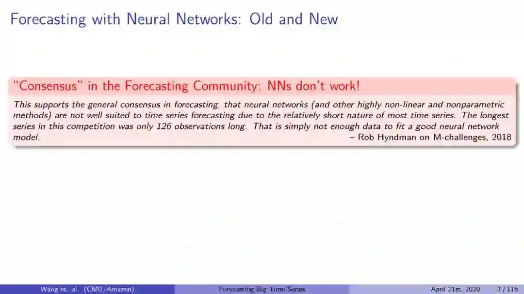 本教程的目标是为解决大规模预测问题提供最重要的方法和工具的简明和直观的概述。我们回顾了三个相关领域的研究现状: (1)时间序列的经典建模,(2)预测的现代方法,包括张量分析和深度学习。此外,我们还讨论了建立大规模预测系统的实际问题,包括数据集成、特征生成、回溯测试框架、误差跟踪和分析等。我们的重点是提供一个直观的概述方法和实际问题,我们将通过案例研究和互动材料与Jupyter笔记本说明。