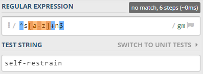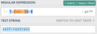 没关系,我们把 - 加入字母集合里,写成 [a-z-]+,注意第一个 - 表示从 a 到 z,第二个 - 表示短连接线。现在可以匹配 self-restrain 了。