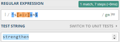 现在 sun 和 strengthen 都可以匹配出来了。起作用的是 [a-z]+,[a-z] 表示小写的字母 a 到 z 的集合,而 + 代表大于一次,联合在一起的意思就是该单词“以 s 开头,以 n 结尾,中间有大于一个的任何小写字母”。