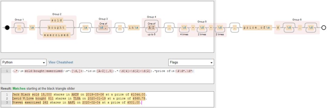 pat = r'([a-zA-Z. ]*)' \'\s(sold|bought|exercised)' \'\s*([\d,]+)' \'.*in\s([A-Z]{,5})' \'.*(\d{4}-\d{2}-\d{2})' \'.*price of\s(\$\d*.\d*)'re.findall( pat, news )