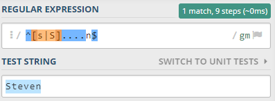 上面的 RE 定义的模式如下:任何 6 个字符的单词,以 s 开头 (^s 的效果),以 n 收尾 (n$ 的效果)。之所以是 6 个字符,是因为有 4 个点 (.) 加上 s 和 n 字符。用上面那个网站做验证,这个 RE ^s....n$ 的若干匹配结果如下: