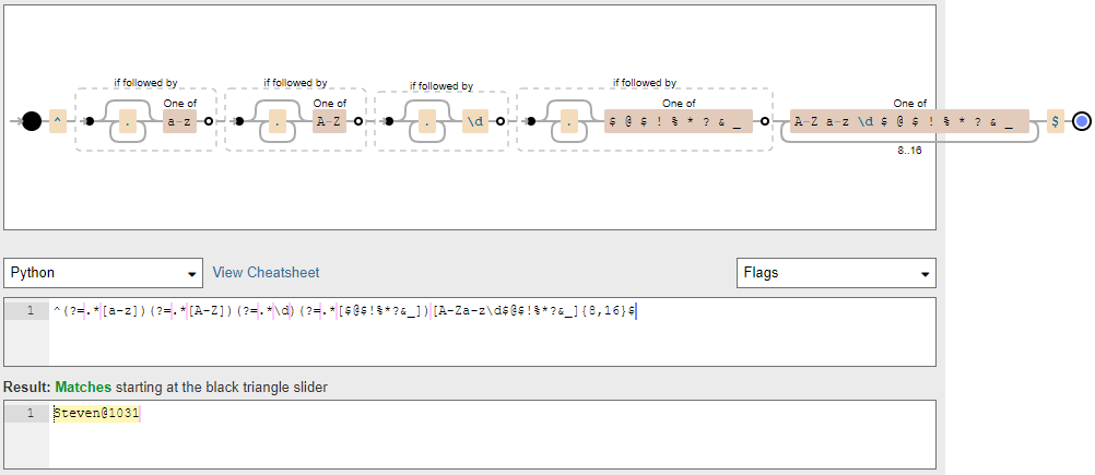 pat = r'^(?=.*[a-z])(?=.*[A-Z])(?=.*\d)(?=.*[$@$!%*?&_])[A-Za-z\d$@$!%*?&_]{8,16}$'print( look_for(pat, 'stevenwang') )print( look_for(pat, '19831031') )print( look_for(pat, 'steven1031') )print( look_for(pat, 'steven@1031') )print( look_for(pat, 'Steven@1031') )print( look_for(pat, 's1031') )print( look_for(pat, 's@1031') )print( look_for(pat, 'stevenwang19831031') )print( look_for(pat, 'stevenwang@19831031') )