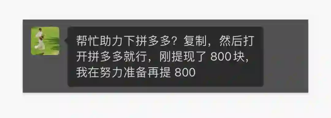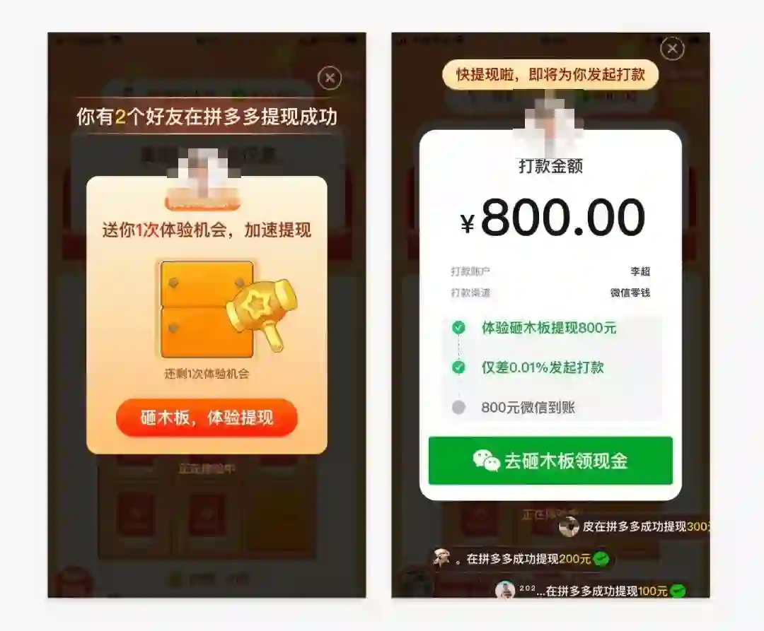 在活动过程中,拼多多还增加了体验玩法。用户不注意的情况下,以为真的提现成功了,那一刻激动的心情会激发用户对提现成功的渴望,吸引用户更加积极地去分享。