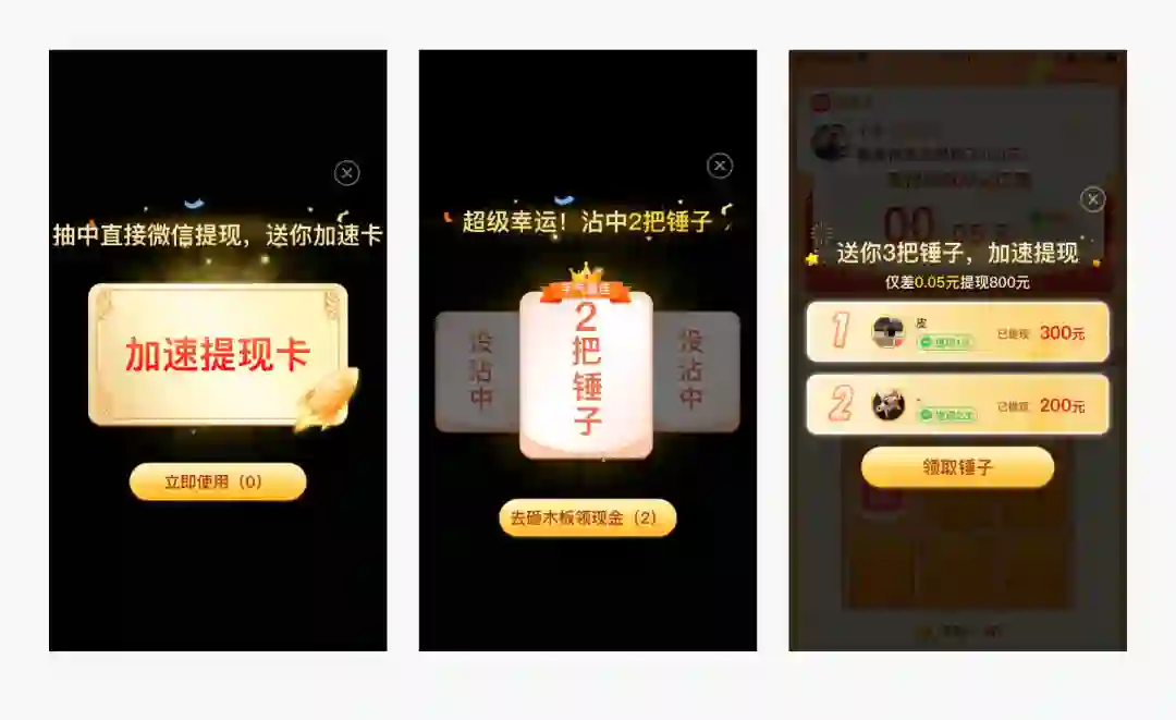 拼多多采用的是砸两块木板,赠送一把锤子的方式。通过这种玩法,降低用户行为的难度,不断迫近提现目标,最终增强用户的行为动机。