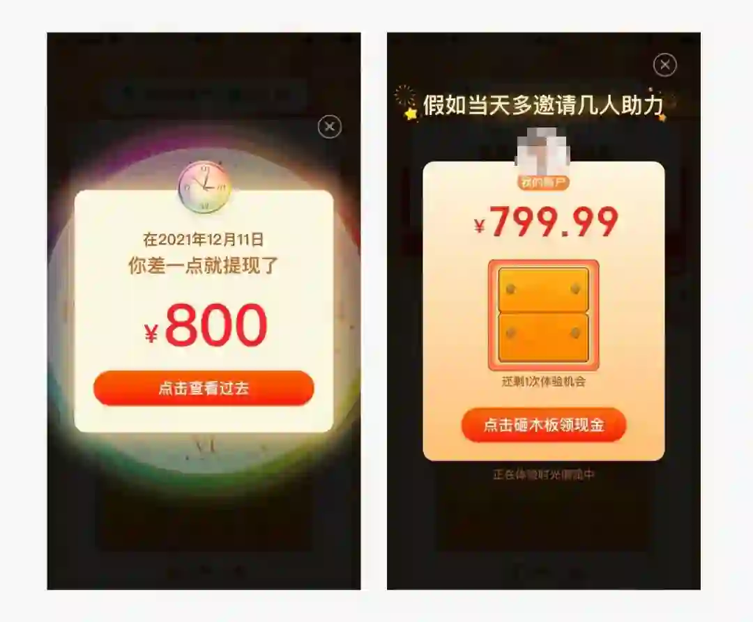 对于之前曾经玩过游戏,但没有成功提现的用户,拼多多还专门设置了时光倒流的玩法。告知用户上次如果再努力一把,就可以成功提现了。