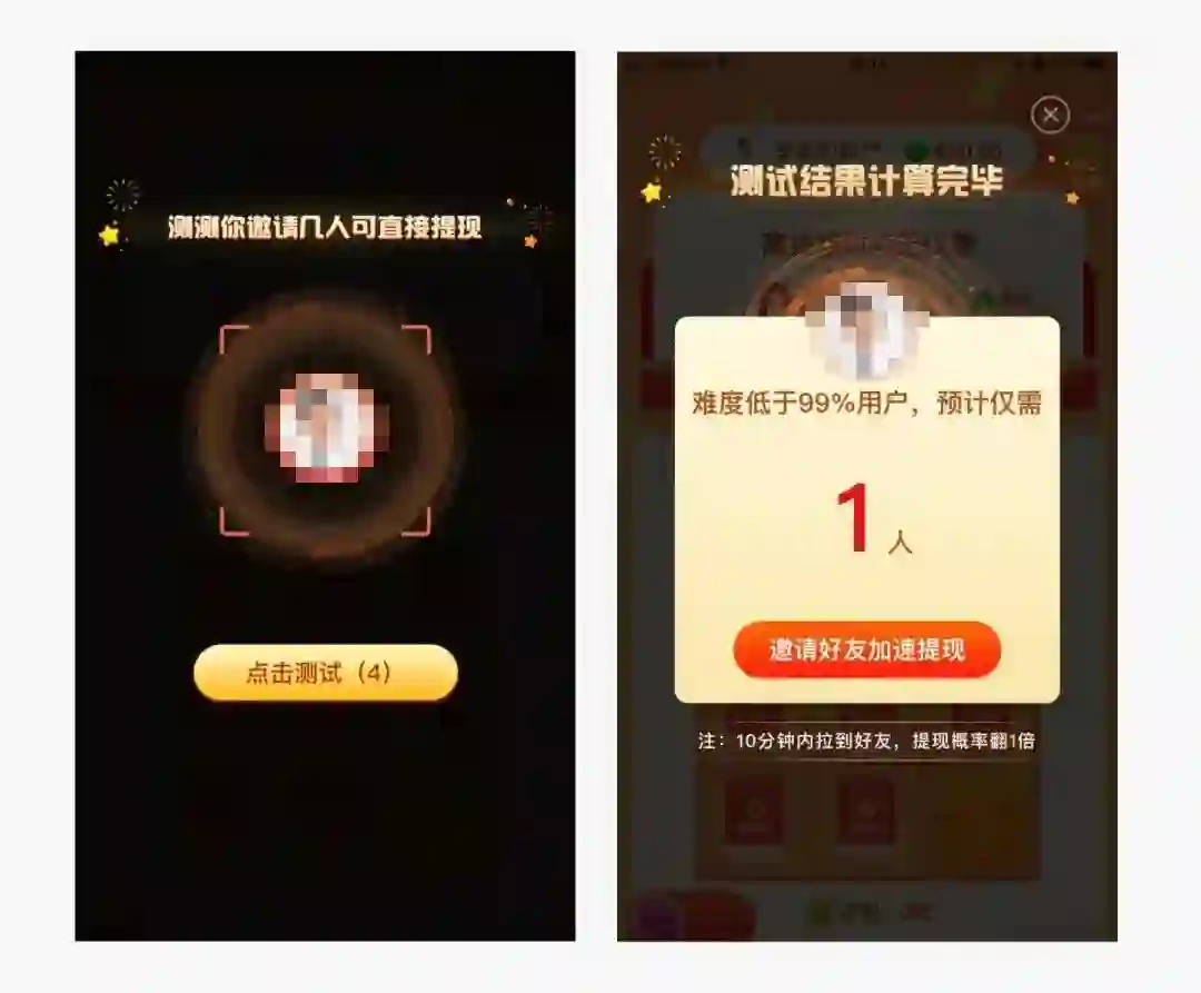 通过一系列的视觉场景,告诉用户10分钟之内,再邀请1人就有机会提现,帮助用户建立信心和希望。