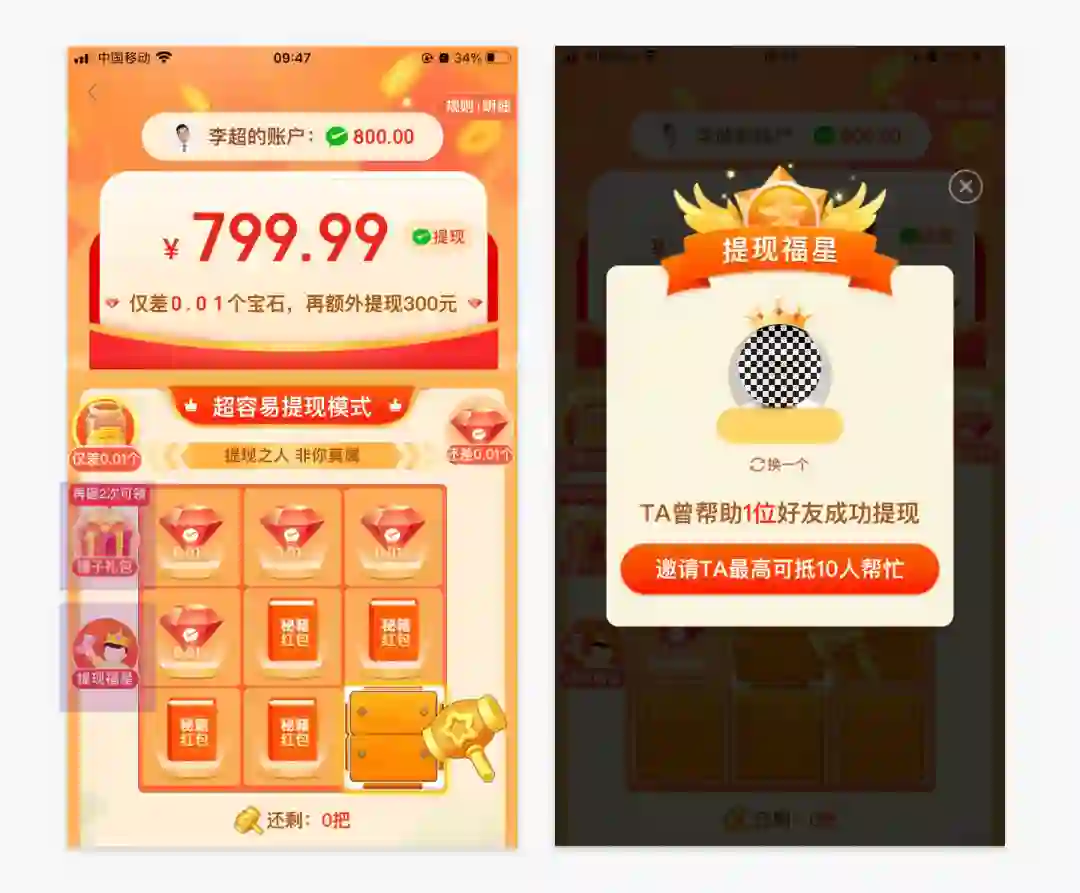比如赠送、翻倍卡、直接体现卡、专属特权等等,不断地减少任务金额,并把用户带入到玩法中,产生提现特别容易的错觉,保证用户不会轻易离开。