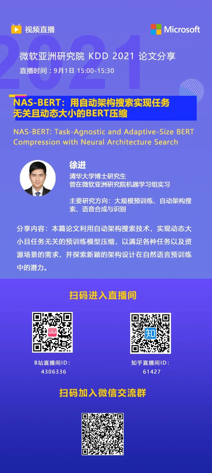 KDD 2021论文直播 | 用自动架构搜索实现任务无关且动态大小的BERT压缩