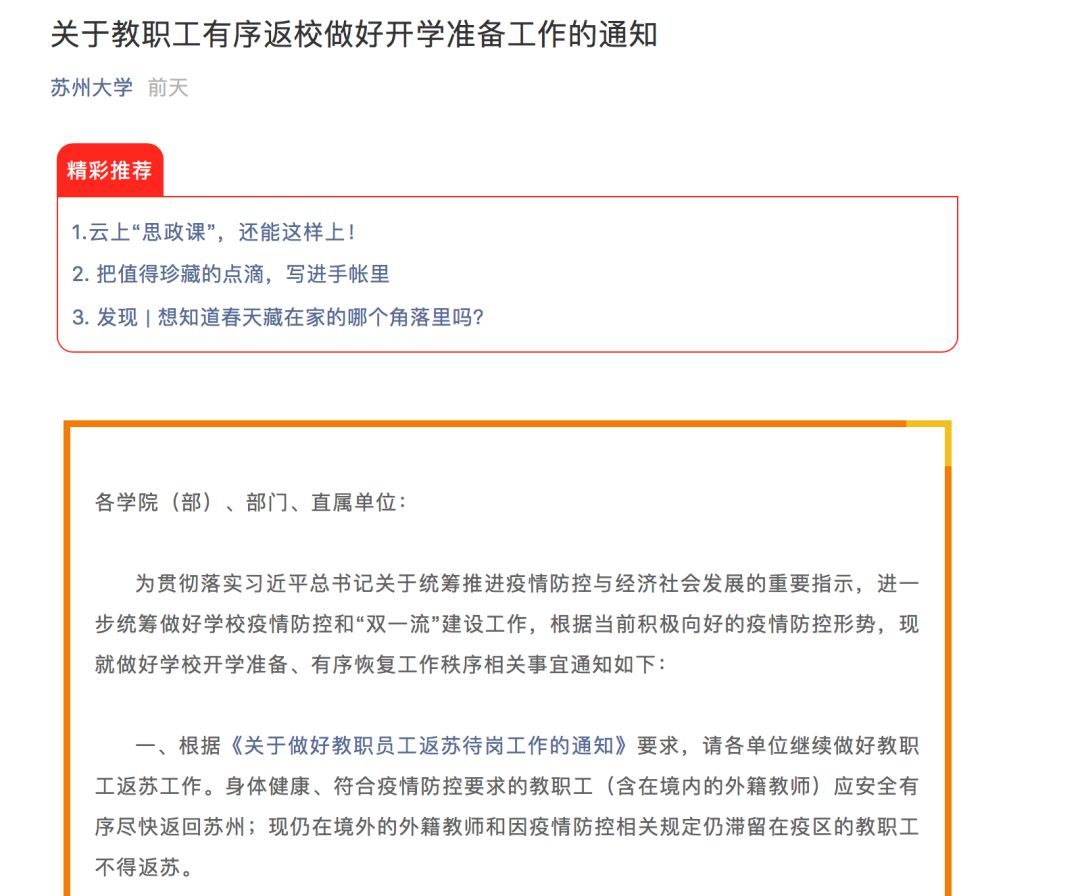 3月13日,苏州大学微信公众号发布了《关于教职工有序返校做好开学准备工作的通知》。