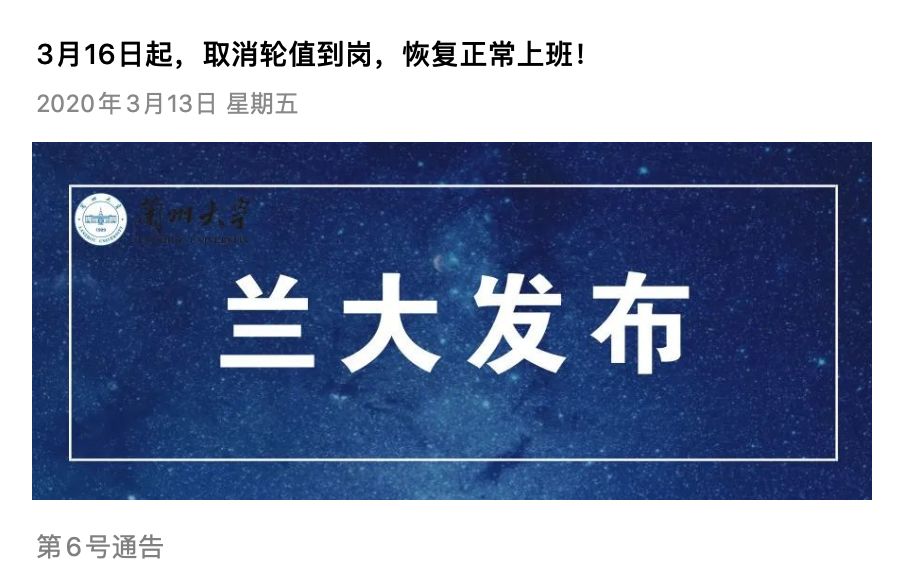 3月13日,兰州大学官微发布《关于取消轮值到岗 恢复正常上班的通知》,通知表示,
